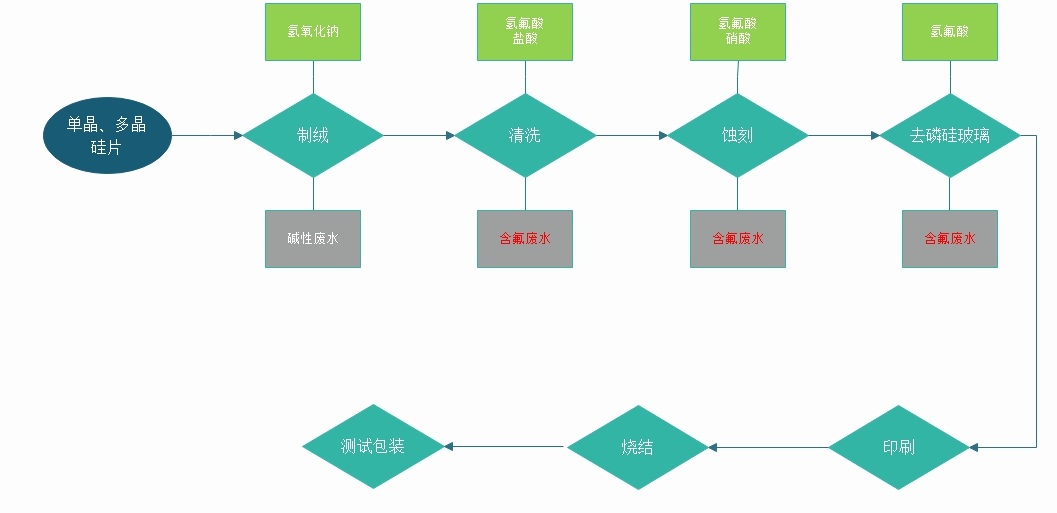 光伏行業(yè)含氟廢水主要來源于電池車間,電池車間的工藝為:制絨,擴(kuò)散,濕法刻蝕,噴涂減反射膜,印刷燒結(jié)。其中硅片制絨和刻蝕兩個工序產(chǎn)生廢水,包括費酸液(硝酸+氫氟酸、氫氟酸+鹽酸或氫氟酸)、廢堿液、酸清洗水、堿清洗水。其中廢酸液和廢堿液水量較小,為間歇排放,酸清洗水和堿清洗水水量較大,水質(zhì)相對穩(wěn)定。其常見生產(chǎn)工藝為: