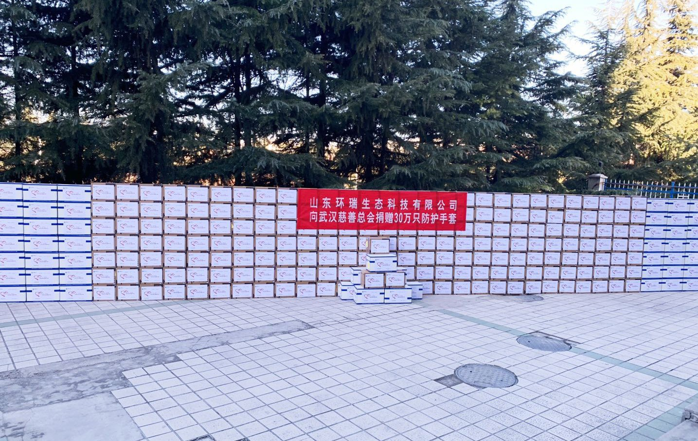山東環(huán)瑞生態(tài)于2月17日向武漢慈善總會(huì)捐贈(zèng)了30萬只防護(hù)手套,一箱一箱的手套不僅代表了公司的心意,還承載了我們同舟共濟(jì)、守望相助的決心。