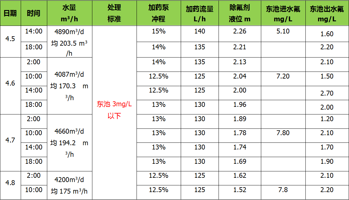 由數據可明顯看出,山東環瑞生態的高效除氟劑可有效降低污水中的氟含量,相比其它的除氟藥劑,添加量少,功效好,可將出水氟化物控制在1mg/L。