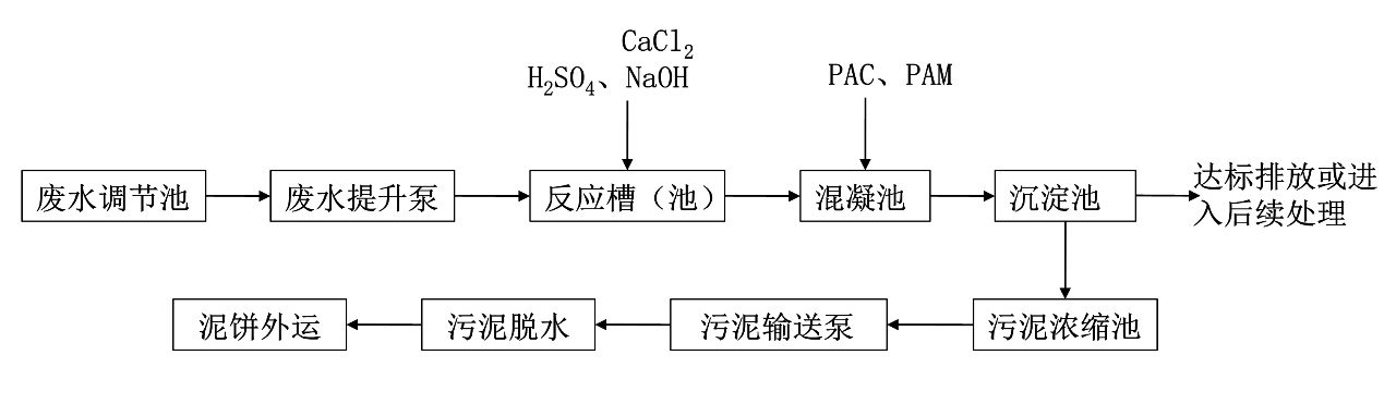 流程圖說明:此處理流程較為簡單,設(shè)定好一定條件即可將污水中氟化物降低到要求值以下。