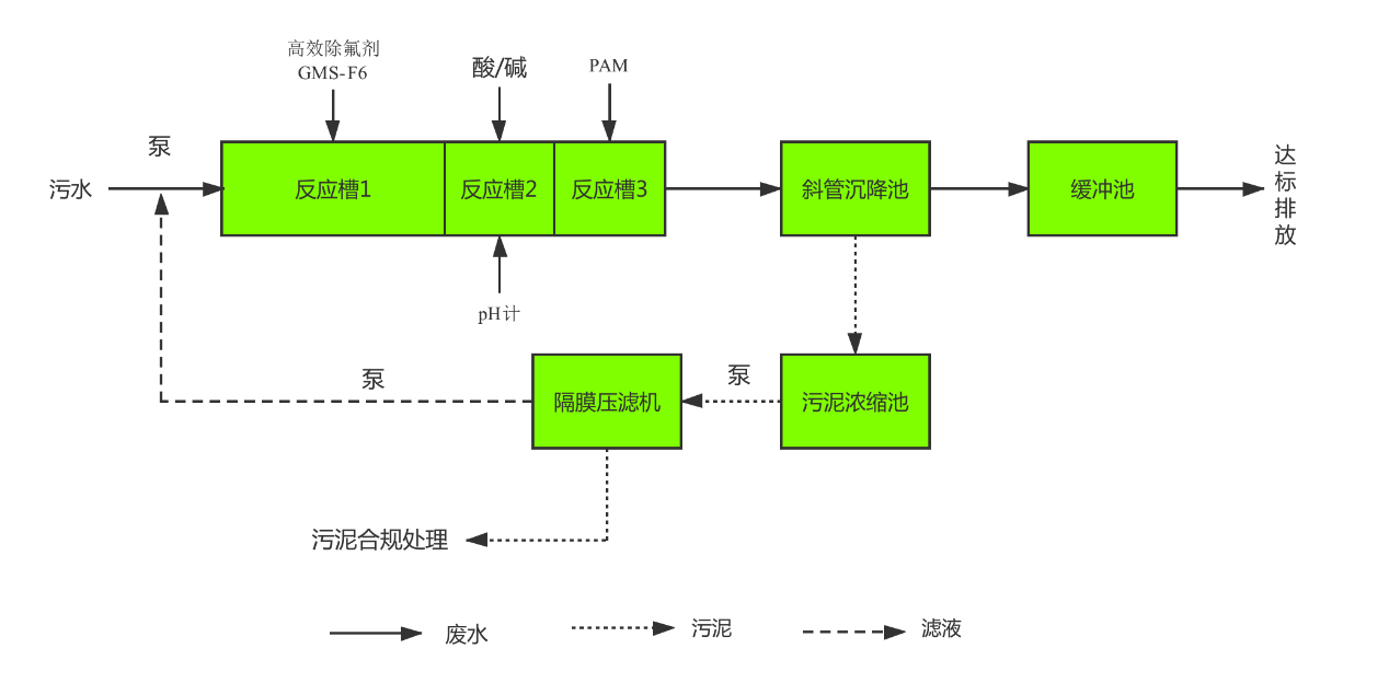 使用我司高效除氟劑進行簡單的混凝沉降,即可將廢水中氟化物降低至1ppm以下,工藝流程圖如下圖所示: