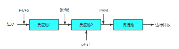 低濃度含氟廢水是指含氟在20mg/L左右,因這部分廢水已無法經鈣鹽處理繼續降低,而通過吸附等方法又無法大規模運行。針對這部分廢水可使用我公司液體除氟劑GMS-F4或固體除氟劑GMS-F6,一步處理,直接達標排放,具體流程如下: