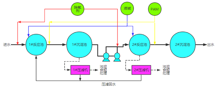 本項目廢水為煤制氣后產生,水量約120m3/h,氟化物含量在70-100mg/L之間波動,根據廠家要求和反復試驗驗證,環瑞生態技術人員最終確定采用兩步處理連續運行的方式,在已有設備情況下進行改造,具體流程大致如下: