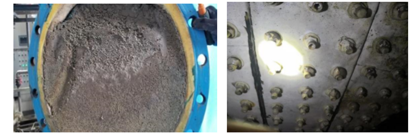 其次,使用鈣鹽運行時,在水流緩慢(吸附塔、過濾器等)和濾徑較小的工段,容易發(fā)生析鹽現(xiàn)象,這會引起管道堵塞及結(jié)垢(我司以往客戶使用均出現(xiàn)類似情況,具體如下圖所示),需后續(xù)定期清理,影響運行的穩(wěn)定性。