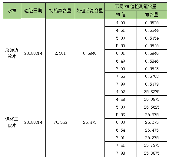 1、反滲透濃水氟化物原始值為2.5013mg/L,經處理后氟化物為0.5846mg/L;取處理后清夜,分別調節不同PH值,從4.00至7.99,檢測結果從0.5679mg/L至0.5846mg/L,波動率為2.86%,在誤差范圍之內;