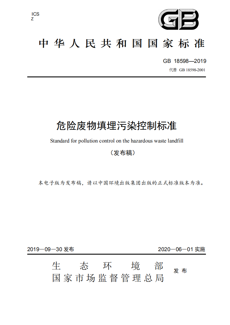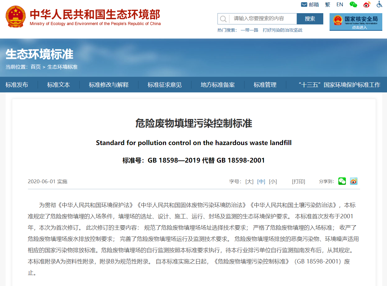2020年6月起,實施新版《危險廢物填埋污染控制標準》本標準首次發布于2001年,本次為首次修訂