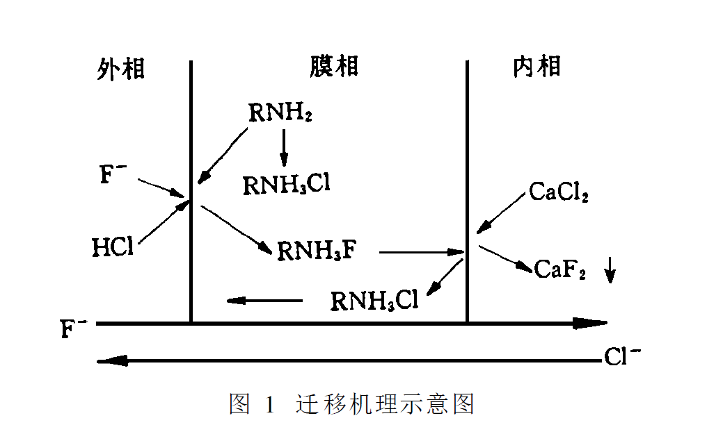 液膜法將溶液分成外相、膜相、內(nèi)相三部分。其除氟機(jī)理是用膜相中適當(dāng)?shù)牧鲃?dòng)載體與廢水中外相的氟離子進(jìn)行陰離子交換反應(yīng),然后帶有氟離子的流動(dòng)載體再與內(nèi)相中的試劑進(jìn)行陰離子交換反應(yīng),交換出,形成難溶性氟化物從而達(dá)到去除氟的效果。