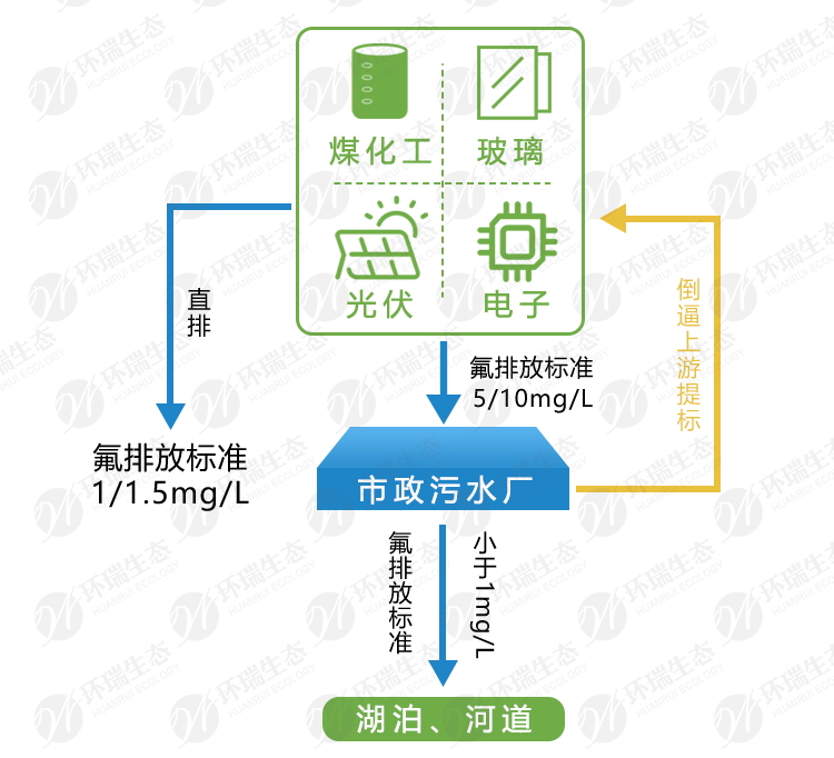 一些下游的污水處理廠能夠通過合并多股廢水的方式稀釋總排水的氟濃度,但各地區環保局紛紛對相對應的污水處理廠提高含氟廢水的標準至小于1mg/L,進而導致污水處理廠反過來限制上游的各類產生含氟廢水工廠只能排放比以往更低的含氟廢水。