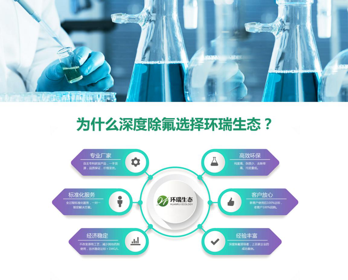 針對現在國家標準的排放規定,山東環瑞生態研制出高效除氟劑,除氟劑反應機理:利用有效組分高正電荷密度、中聚合度等特點,促使其羥基位點快速與廢水中的F-絡合形成穩定的配合物;同時因正電荷密度降低,加速配合物聚集沉淀,實現游離態氟向顆粒態氟的轉化,再經高分子絮凝劑搭橋、捕捉等作用,快速實現泥水分離,達到廢水除氟目的,可針對不同濃度進行氟的處理。